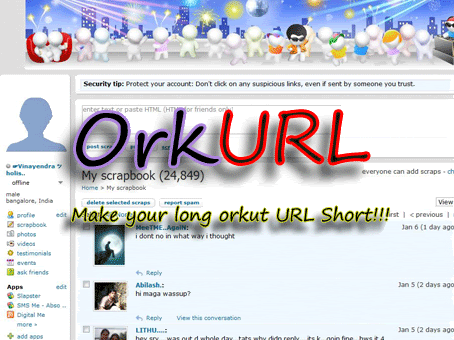 We are happy to announce our new orkut app has been approved . We have named is OrkURL as it shortens your Orkut URL . OrkURL is a FREE service which provides shortening of any URL. If you think a URL is too long and difficult to remember then use this service to make a short and meaningful URL. You can visit OrkURL.com to shorten your URL or use our orkut app . Here is a tutorial which helps you in using the orkut app.